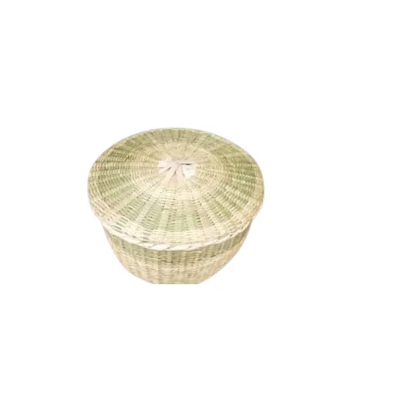 A finely crafted round basket with a fitted lid, made from natural fibers. Suitable for storing clothes, toys, or household items while adding a rustic touch to any room