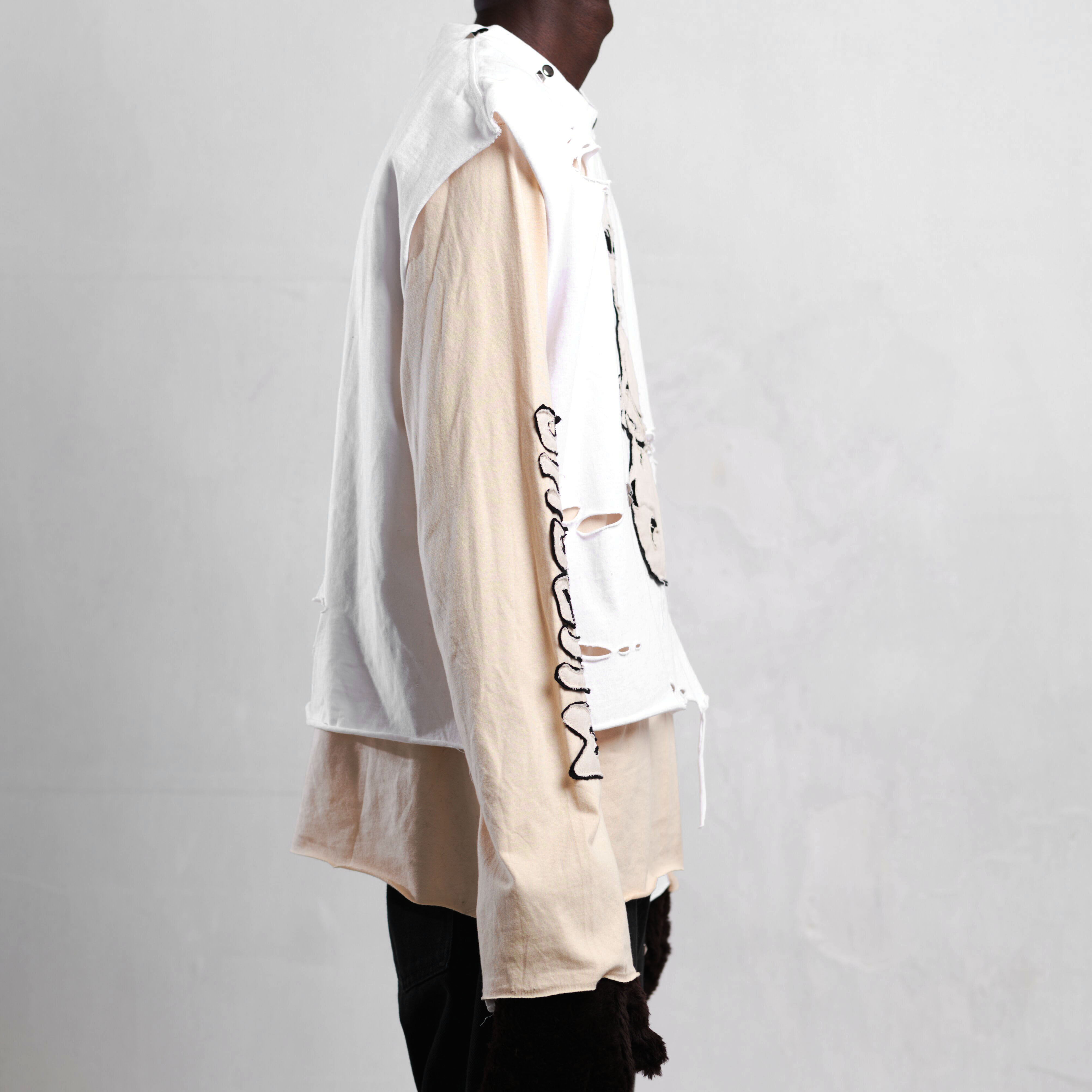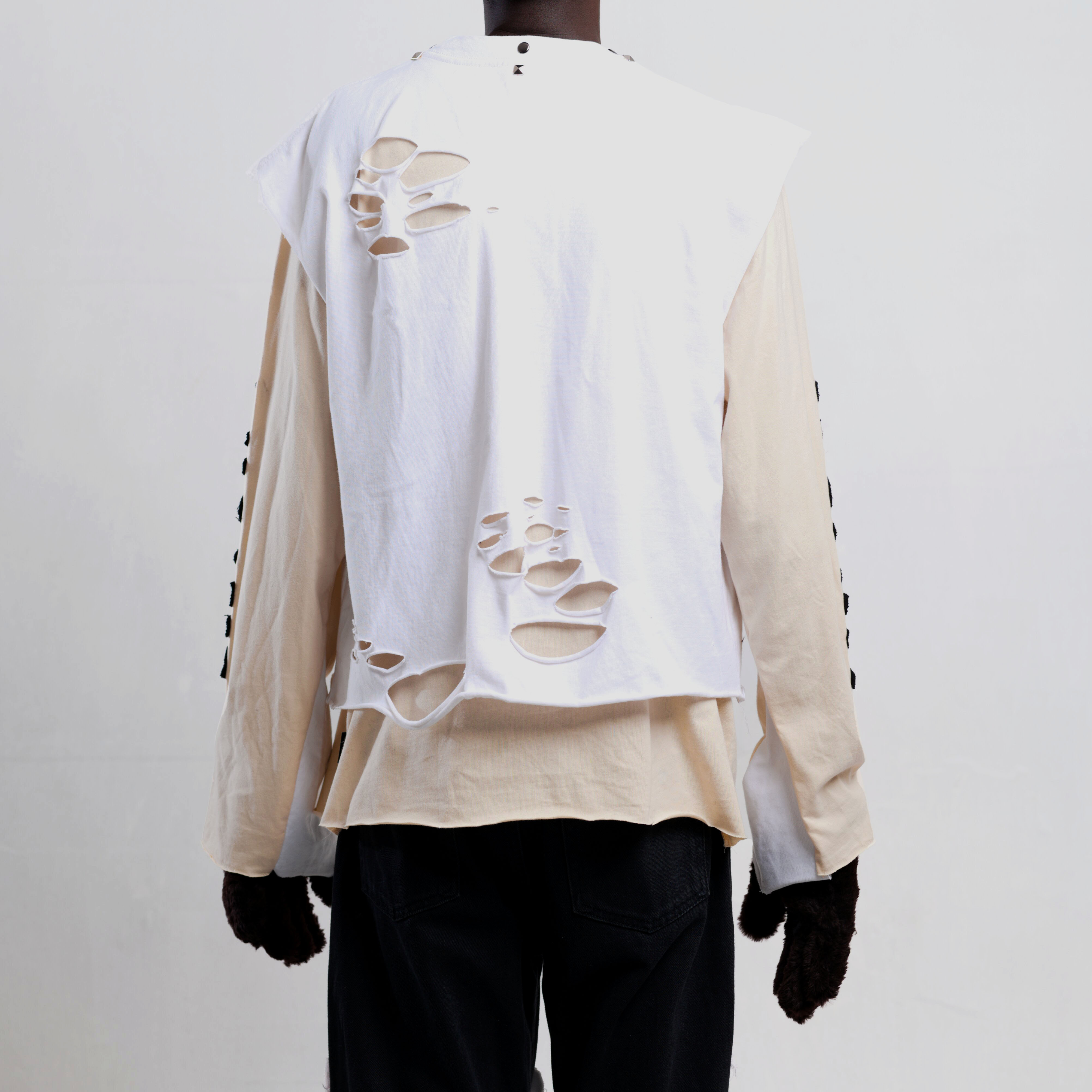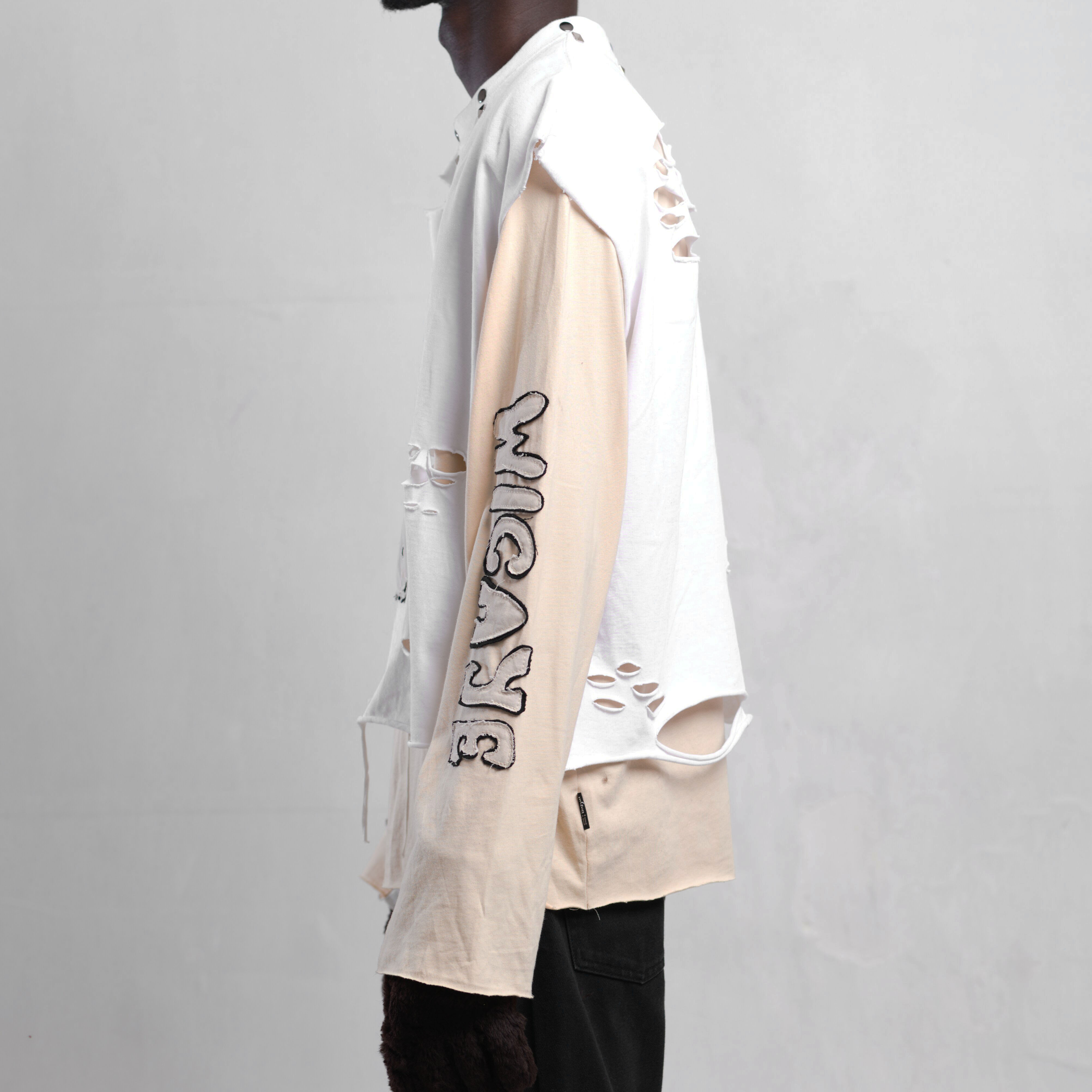 This one-of-one LUNAROOT 100% cotton two-piece t-shirt, featuring a distressed white layer with alien graphic, over beige long sleeves. Sleeves showcase cut-and-sew fabric lettering reading “MUZEHE WICAYE” (old man sitting) a nod to the alien front design. With its bold mix of white and beige tones, layered fit, and exclusive detailing, this shirt is wearable art made to stand out.