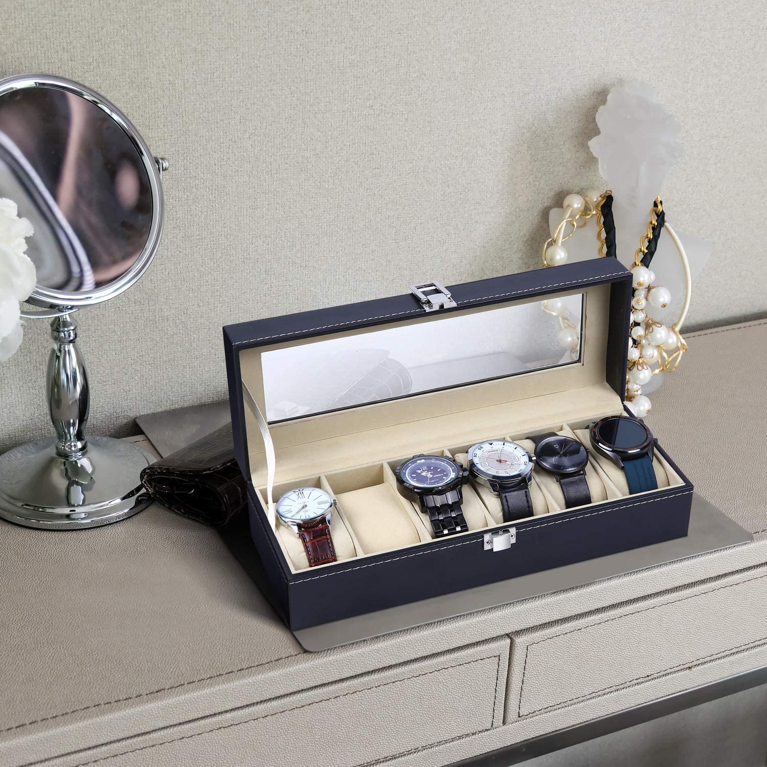 - 6 SLOTS WITH REMOVABLE CUSHIONS: With six slots, you'll have plenty of room to fit all of your accessories. Cushions store your watches in an upright position and effectively eliminate scratches. Need more room? Simply remove the cushions to create more space.