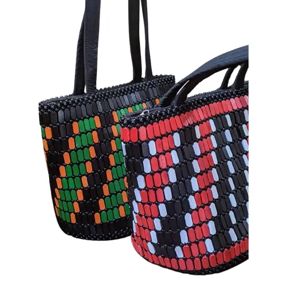 MUNYANA Large Beaded & Wood Strip Tote Bag – Women’s Woven Handbag with Wooden Beads
