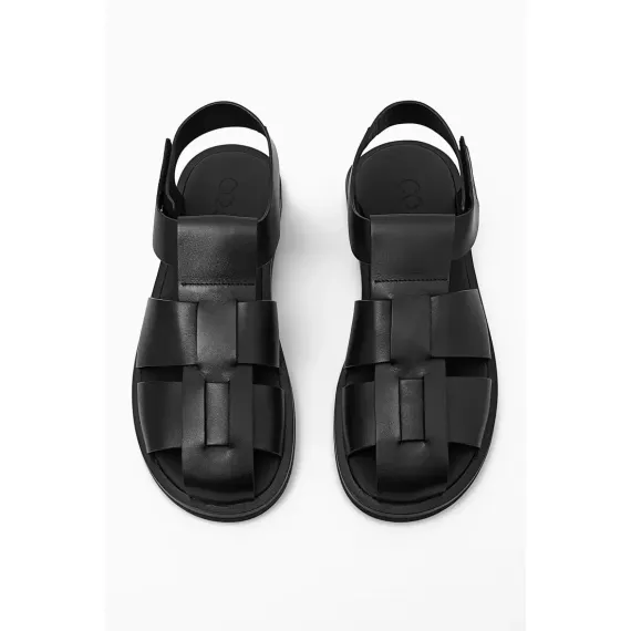 These sleek black leather sandals boast a contemporary woven strap design that creates a structured, geometric look. Featuring a secure ankle strap and a flat, cushioned sole, they offer both style and support. The minimalist aesthetic makes them versatile enough for work, urban walks, or smart-casual events. Made from high-quality leather with clean lines and subtle branding, these sandals reflect modern elegance and durability.